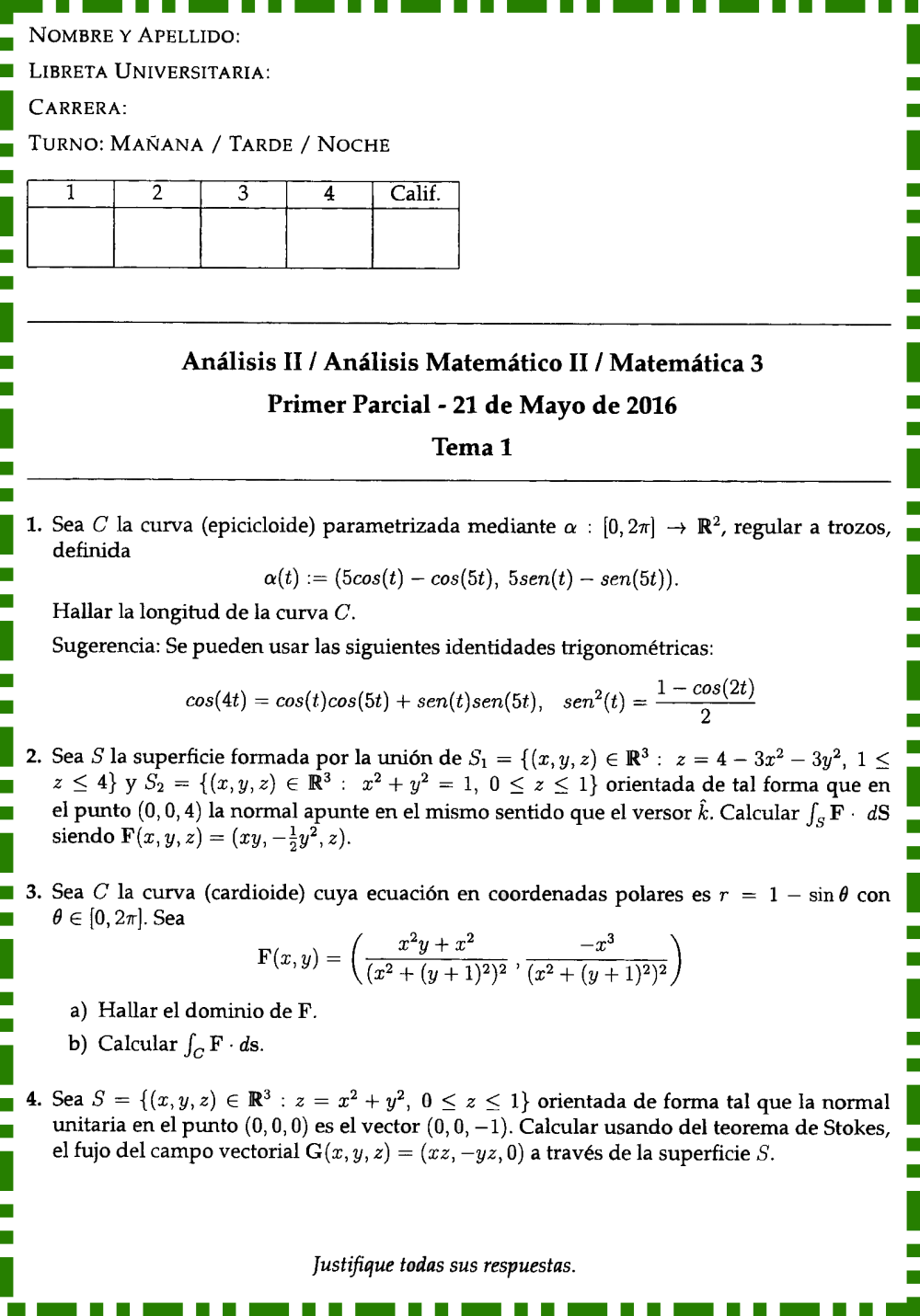 Materia: Análisis II, Análisis Matemático II o Matemática 3 | Tipo de examen: 1er Parcial | Fecha: 21 de mayo de 2016 | Tema 1